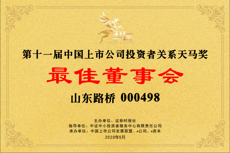山東路橋第11屆中國上市公司投資者關(guān)系天馬獎(jiǎng)寄語,黨委書記、董事長王振江: 山東路橋堅(jiān)持生產(chǎn)經(jīng)營和資本運(yùn)作“雙輪驅(qū)動”,發(fā)展質(zhì)量和效益增長“兩翼齊飛”。公司作為全國首批公路工程施工總承包特級資質(zhì)企業(yè),擁有施工“雙特級”和設(shè)計(jì)“雙甲級”等69項(xiàng)資質(zhì),先后參與全國三十幾個(gè)省市的路橋施工建設(shè),用一流的質(zhì)量樹立了信得過的“山東路橋”品牌形象。同時(shí),公司堅(jiān)持規(guī)范與發(fā)展并重,信披與治理并行,以“富員強(qiáng)企、通達(dá)天下”為使命,做讓投資者看得見、看得清的上市公司,打造基業(yè)長青的百年老店。未來,公司將充分把握高質(zhì)量發(fā)展契機(jī),不斷挖掘新的收入、利潤增長點(diǎn),走穩(wěn)健合規(guī)發(fā)展之路。扎根實(shí)體,練好內(nèi)功,突出主業(yè),弘揚(yáng)企業(yè)家精神和工匠精神,與投資者共享發(fā)展紅利。