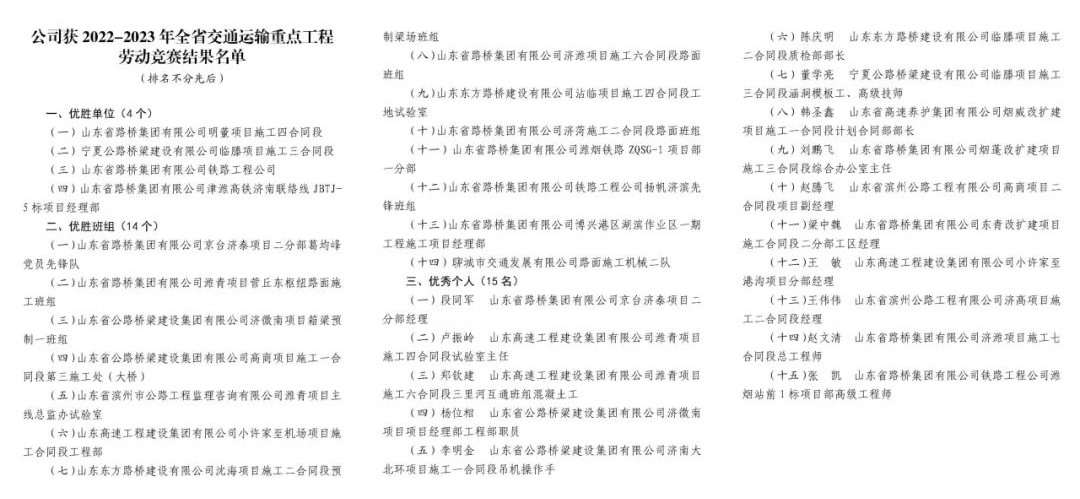 近日,山東省交通運輸廳、山東省總工會聯(lián)合公布了2022-2023年全省交通運輸重點工程勞動競賽結果,公司在競賽中榮獲4個優(yōu)勝單位、14個優(yōu)勝班組和15名優(yōu)秀個人。